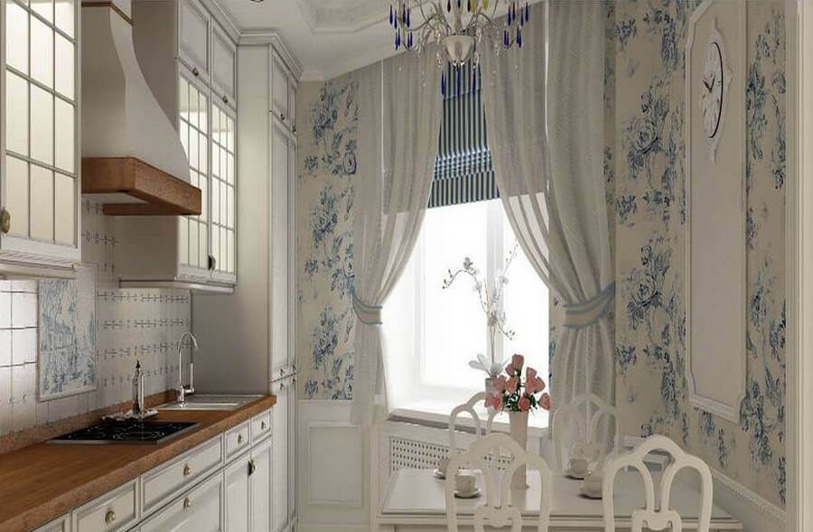 Для кухни в стиле прованс оптимальны лёгкие натуральные ткани — лен, хлопок или их смеси. Идеальны пастельные оттенки, мелкие цветочные узоры, клетка и полоска. Римские шторы с мягкой драпировкой создают воздушность, а лёгкий тюль пропускает дневной свет, поддерживая домашний уют. Карниз лучше выбирать из дерева или окрашенного металла с декоративными наконечниками. Практично сочетать плотные шторы для вечера и тюль для дневного света — это создает гибкость освещения и уютную атмосферу.